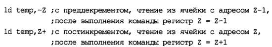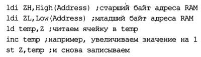 Покажем основной порядок действий при чтении из памяти в случае использования регистра z (r31:r30). Чтение одной ячейки с заданным адресом Address, коррекция ее значения и обратная запись производятся так: