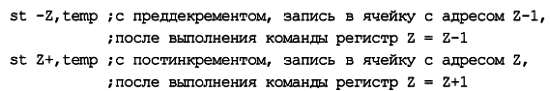 Для чтения и записи SRAM предназначены регистры х, y и z — т. е. пары r27:r26, r29:r28 и r31:r30, которые по отдельности еще именуют XH: XL, YH: YL, ZH: ZL — в том же порядке (т. е. старшим в каждой паре служит регистр с большим номером). Если обмен данными производится между памятью и другим регистром общего назначения, то достаточно задействовать только одну из этих пар (любую), если же между областями памяти — целесообразно задействовать две. Независимо от того, какую из пар мы используем, чтение и запись происходят по идентичным схемам, меняются только имена регистров.