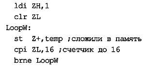 А вот как можно в цикле записать одно и то же значение из temp в 16 идущих подряд ячеек памяти, начиная с нулевого адреса старших 256 байтов памяти: