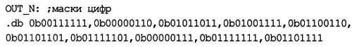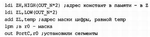 Затем в процедуре индикации мы читаем эти константы с помощью инструкции lpm, которая специально предназначена для чтения констант из памяти программ. Инструкция находит их по адресу, в данном случае по метке OUT_N (т. к. адресация в памяти производится байтами, а нумерация команд выполняется словами, то адрес метки приходится умножать на два). После чего выводим в порт С непосредственно маску цифр: