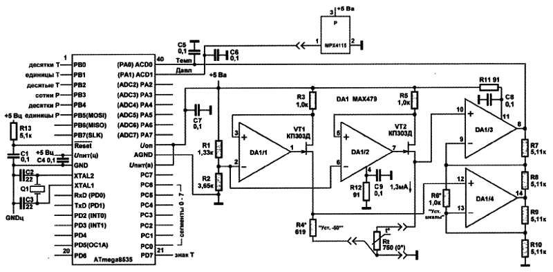 Рис. 20.4. Схема измерителя температуры и давления на МК ATmega8535