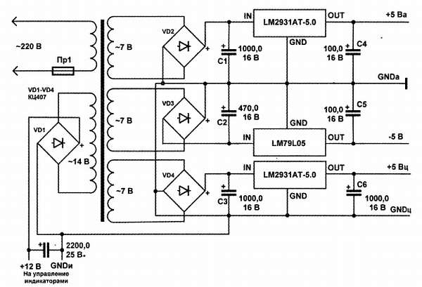 » здесь обозначена аналоговая «земля» GNDa. Линия цифровой «земли» обозначена GNDц, кроме этого, имеется еще общий провод индикаторов GNDи. Все три «земли» соединяются только на плате источника питания. Отмечу, что готовый трансформатор с характеристиками, указанными на схеме, вы можете не найти. Поэтому смело выбирайте тороидальный трансформатор мощностью порядка 10–15 Вт на напряжение вторичной обмотки 10–12 В (которое будет использоваться для индикаторов и стабилизатора +5 Вц), измерьте на нем количество витков на вольт (как описано в главе 9) и домотайте три одинаковых обмотки на 7–8 В, каждая поверх существующих, проводом не тоньше 0,3 мм в диаметре. Удобнее всего их мотать одновременно сложенным втрое проводом заранее рассчитанной длины.