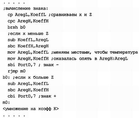 Это несложно сделать, если представить формулу пересчета значений температуры в виде уравнения N = K·|x — Z|, где N — число на индикаторе, х — текущий код АЦП, Z — код АЦП, соответствующий нулю градусов Цельсия (при наших установках он должен соответствовать примерно середине диапазона). Чтобы вычислить значение абсолютной величины, нам придется сначала определять, что больше — х или Z, и вычитать из большего меньшее. Заодно при этой операции сравнения мы определяем значение знака. Если в регистрах AregH: AregL содержится значение текущего кода АЦП х, а в регистрах KoeffH: KoeffL значение коэффициента Z, то алгоритм выглядит примерно вот так: