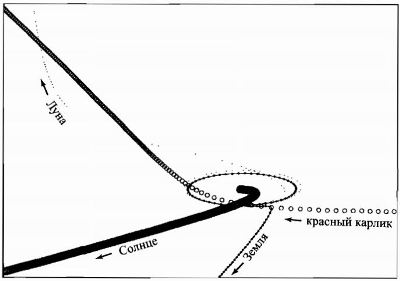 Близкое прохождение трех звезд — крайне сложное предприятие, и его исход находится в достаточно чувствительной зависимости от начальных скоростей и положений этих звезд. На рис. 11 изображен один из возможных исходов. В данном случае Земля переходит на эллиптическую орбиту красного карлика. Вероятность подобного спасения Земли представляется ничтожной: один шанс на три миллиона.