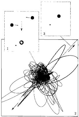 Рис. 10. На данной компьютерной модели изображена реакция Земли, Луны и Солнца на вторжение красного карлика, масса которого равна одной четвертой массы Солнца. Согласно предсказаниям этой модели Земля будет выброшена из Солнечной системы с огромной скоростью. Однако вероятность того, что нечто подобное произойдет прежде, чем Солнце превратится в красного гиганта, очень мала: всего лишь одна сто тысячная (1 из 105)
