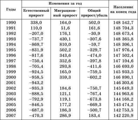 Таблица 11. Компоненты изменения численности населения России в 1990—2007 гг., тыс. чел.