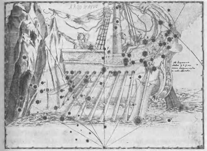 Рис. 1.12. Изображение не существующего ныне созвездия Корабль Арго в «Уранометрии» Иоганна Байера (1603 г.).