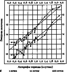 В 1908 и 1912 годах Генриетта Суон Ливитт опубликовала в обсерватории Гарвардского колледжа свое исследование переменных звезд в Малом Магеллановом Облаке. Эта куча звезд, звездных скоплений и туманностей была сфотографирована на Гарвардской станции в Перу. Изучив фотопластинки, Ливитт обнаружила там 2400 переменных звезд. Для некоторых из этих звезд она смогла определить период переменности, построив график зависимости их блеска от времени. Ливитт заметила, что чем длиннее период, тем ярче звезда в своем нормальном состоянии, А поскольку все звезды Малого Магелланова Облака находятся практически на одинаковом расстоянии от нас, истинная светимость и период ее переменности у звезд типа дельты Цефея должны быть тесно связаны (рис. 20.7).