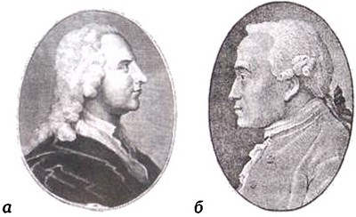 Рис. 20.2. (а) Томас Райт (1711–1786) и (б) Иммануил Кант (1724–1804). Эти мыслители, а также Иоганн Генрих Ламберт рассматривали Млечный Путь как проекцию трехмерной звездной системы.