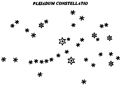 Рис. 20.1. Галилей увидел в свой телескоп гораздо больше тусклых звезд в Плеядах, чем те шесть ярких звезд, которые обычно видны невооруженным глазом. На этом рисунке из его «Звездного вестника» яркие звезды показаны более крупными.
