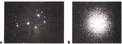 В 1914 году Шепли начал работать в обсерватории Маунт-Вилсон, которая обладала тогда крупнейшим в мире телескопом (1,5 м). Шепли занялся изучением цефеид в шаровых звездных скоплениях, чтобы использовать их для определения расстояний. Что такое шаровое звездное скопление? Большинство звездных скоплений — это не очень плотные группы из нескольких сотен звезд, например Плеяды в созвездии Телец. Но шаровые скопления совсем другие: они имеют сферическую форму, и число звезд в них может превышать миллион. В их центре изображения звезд сливаются и образуют ровно светящуюся туманность (рис. 20.8).