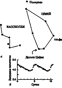 Рис. 20.6. (а) Звезда дельта в созвездии Цефей послужила прототипом переменных звезд-цефеид, (б) Ее блеск меняется с периодом, немного превышающим 5 суток. Переменность этой звезды открыл Джон Гудрайк в 1784 году. Этот английский астроном умер в возрасте всего 21 года, простудившись во время наблюдений.