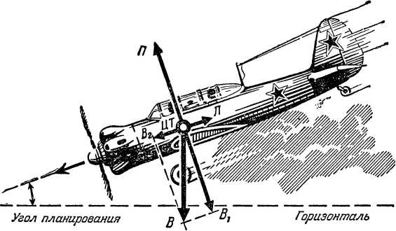 Рис. 27. Действие сил при установившемся планировании самолета: подъемная сила П равна слагаемой силы веса B1, другая слагаемая силы веса В2 равна силе лобового сопротивления Л.
