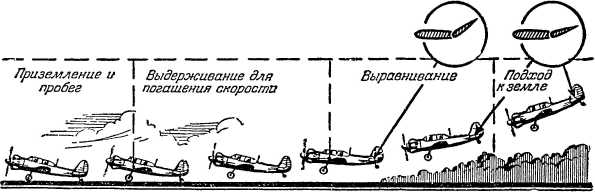 Однако горизонтальный полет возможен, как известно, только в том случае, если подъемная сила равна весу самолета. Между тем из-за отсутствия тяги скорость продолжает падать, поэтому должна уменьшаться и подъемная сила. Поскольку летчик должен приземлить самолет с наименьшей скоростью, то он как можно дольше не дает машине коснуться земли — выдерживает ее над землей, стремясь «погасить» скорость. Для этого летчик постепенно увеличивает угол атаки, чтобы подъемная сила еще некоторое время оставалась равной весу самолета.