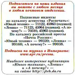 — Не останутся без дела и юные механики-самодельщики, и теоретики, для которых в рубрике «Хотите стать изобретателем?» «Левша» приготовил новые конкурсные вопросы.