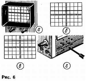 Нажмите кнопку «0,01-1» переключателя 1 —линия развертки может сместиться вверх или вниз. Это будет свидетельствовать о разбалансировке усилителя вертикального отклонения. Если смещение не превышает одного деления масштабной сетки (рис. 6, б), все в порядке. При большем смещении (рис. 6, в) нужно сбалансировать усилитель подстроечным резистором, расположенным за отверстием на правой боковой стенке кожуха (рис. 6, г) — оно показано на рисунке в инструкции. Движок резистора поворачивают отверткой так, чтобы линия возвратилась на прежнее место.