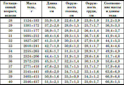 С клинических позиций для объективной характеристики ребенка целесообразно фиксировать и массу тела при рождении, и гестационный возраст ребенка. Параметры физического развития новорожденных в соответствии с гестационным возрастом представлены в табл. 1.