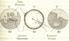 «Линия дихотомии» – четкая линия отреза, разделяющая густо изрытое кратерами южное нагорье и менее испещренные кратерами северные низменности. Девяносто три процента кратеров более 30 километров в диаметре находятся к югу от этой линии, включая массивные бассейны Аргир, Эллада и Исида – древние шрамы от столкновений с астероидами, ключи к смерти целого мира.