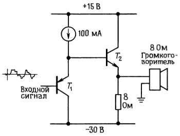 Повторитель T1 на транзисторе р-n-р-типа служит для того, чтобы снизить требования к мощности входного сигнала схемы и скомпенсировать напряжение смещения UБЭ в транзисторе Т2 (напряжение 0 В на входе дает 0 В на выходе). Конечно, для простоты Т1 можно было бы опустить. Большой источник тока, используемый в качестве нагрузки в цепи эмиттера Т1, служит для того, чтобы обеспечить достаточный базовый ток для Т2 при пиковом значении сигнала. Резистор в цепи эмиттера не используют потому, что он должен был бы иметь слишком малое сопротивление (50 Ом или меньше), для того чтобы при пиковом значении сигнала можно было гарантировать базовый ток Т2, равный по крайней мере 50 мА; при этом ток нагрузки был бы максимальным, а падение напряжения на резисторе минимальным; результирующий ток покоя T1 оказался бы чрезмерно большим.
