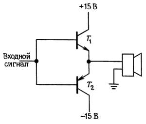 Транзистор Τ1 открыт при положительных значениях сигнала, а транзистор Т2 — при отрицательных. При нулевом входном напряжении коллекторного тока нет и мощность не рассеивается. При выходной мощности 10 Вт каждый транзистор рассеивает мощность менее 10 Вт.