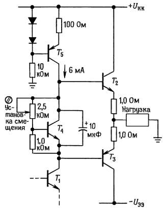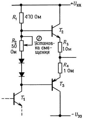 Температурную стабильность схемы можно оценить, если вспомнить, что падение напряжения между базой и эмиттером уменьшается примерно на 2,1 мВ при увеличении температуры на каждый градус (°С), а коллекторный ток увеличивается в 10 раз при каждом увеличении напряжения между базой и эмиттером на 60 мВ. Например, если резистор R2 заменить диодом, то напряжение между базами транзисторов Т2 и Т3 будет равно утроенному падению напряжения на диоде, а на последовательное соединение резисторов R3 и R4 будет приходиться падение напряжения, равное падению напряжения на диоде. (Следовательно, резисторы R3 и R4 должны быть подобраны таким образом, чтобы обеспечивался нужный ток покоя, например 50 мА для усилителя звуковых частот.) Самым худшим для этой схемы является случай, когда смещающие диоды не имеют теплового контакта с выходными транзисторами.