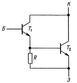 Резистор R предотвращает смещение транзистора Т2 в область проводимости за счет токов утечки транзисторов Т1 и Т2. Сопротивление резистора выбирают так, чтобы токи утечки (измеряемые в наноамперах для малосигнальных транзисторов и в сотнях микроампер для мощных транзисторов) создавали на нем падение напряжения, не превышающее падения напряжения на диоде, и вместе с тем чтобы через него протекал ток, малый по сравнению с базовым током транзистора Т2. Обычно сопротивление R составляет несколько сотен ом в мощном транзисторе Дарлингтона и несколько тысяч ом в малосигнальном транзисторе Дарлингтона.