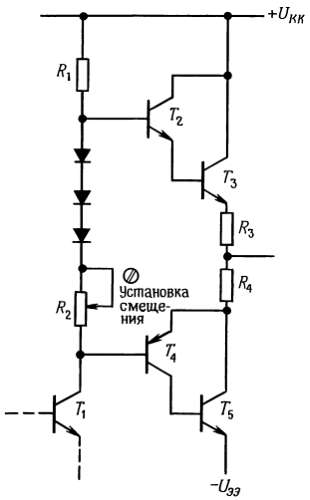 Рис. 2.59. Схема задания смещения двухтактного выходного каскада для уменьшения переходных искажений и повышения температурной стабильности.