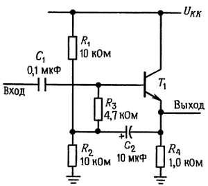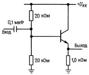 Другой подход к анализу схемы основан на том, что падение напряжения на резисторе R3 для всех частот сигнала одинаково (так как напряжение между его выводами изменяется одинаково), т. е. он представляет собой источник тока. Но сопротивление источника тока бесконечно. На самом деле фактическое значение сопротивления не бесконечно, так как коэффициент усиления повторителя немного меньше 1. Последнее вызывается тем, что падение напряжения между базой и эмиттером зависит от коллекторного тока, который изменяется при изменении уровня сигнала. Тот же результат можно получить, если рассмотреть делитель, образованный выходным сопротивлением со стороны эмиттера [rЭ = 25/IК(мА) Ом] и эмиттерным резистором. Если коэффициент усиления повторителя по напряжению обозначить А (А ~= 1), то действующее значение сопротивления R3 на частотах сигнала равно R3/(1 — А). На практике действующее значение сопротивления R3 больше его номинала приблизительно в 100 раз, и во входном сопротивлении преобладает входное сопротивление транзистора со стороны базы. В инвертирующем усилителе с общим эмиттером может быть выполнена аналогичная следящая связь, так как сигнал на эмиттере повторяет сигнал на базе. Обратите внимание, что схема делителя напряжения смещения запитывается по переменному току (на частотах сигнала) с низкоомного эмиттерного выхода, поэтому входному сигналу не приходится этим заниматься.