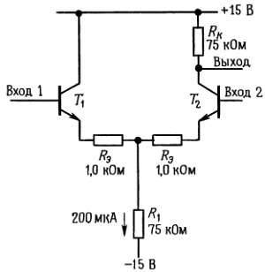 Для этой схемы, в которой использованы монолитная транзисторная пара типа LM394 (транзисторы Т1 и Т2) и источник тока типа 2N5963, величина КОСС определяется отношением 100000:1 (100 дБ). Диапазон входного синфазного сигнала ограничен значениями —12 и +7 В; нижний предел определяется рабочим диапазоном источника тока в эмиттерной цепи, а верхний — коллекторным напряжением покоя.