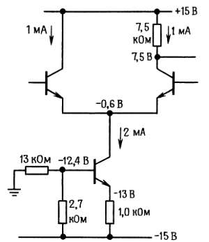 Не забывайте о том, что в этом усилителе, как и во всех транзисторных усилителях, должны быть предусмотрены цепи смещения по постоянному току. Если, например, для межкаскадной связи на входе используется конденсатор, то должны быть включены заземленные базовые резисторы. Еще одно предостережение относится в особенности к дифференциальным усилителям без эмиттерных резисторов: биполярные транзисторы могут выдержать обратное смещение на переходе база-эмиттер величиной не более 6 В, затем наступает пробой; значит, если подать на вход дифференциальное входное напряжение большей величины, то входной каскад будет разрушен (при условии, что отсутствуют эмиттерные резисторы). Эмиттерный резистор ограничивает ток пробоя и предотвращает разрушение схемы, но характеристики транзисторов могут в этом случае деградировать (коэффициент h21Э, шумы и др.). В любом случае входной импеданс существенно падает, если возникает обратная проводимость.