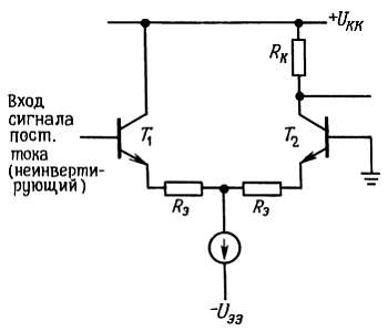 Дифференциальный усилитель — это широко известная схема, используемая для усиления разности напряжений двух входных сигналов. В идеальном случае выходной сигнал не зависит от уровня каждого из входных сигналов, а определяется только их разностью. Когда уровни сигналов на обоих входах изменяются одновременно, то такое изменение входного сигнала называют синфазным. Дифференциальный или разностный входной сигнал называют еще нормальным или полезным. Хороший дифференциальный усилитель обладает высоким коэффициентом ослабления синфазного сигнала (КОСС), который представляет собой отношение выходного полезного сигнала к выходному синфазному сигналу, при условии что полезный и синфазный входные сигналы имеют одинаковую амплитуду. Обычно КОСС определяют в децибелах. Диапазон изменения синфазного входного сигнала задает допустимые уровни напряжения, относительно которого должен изменяться входной сигнал.