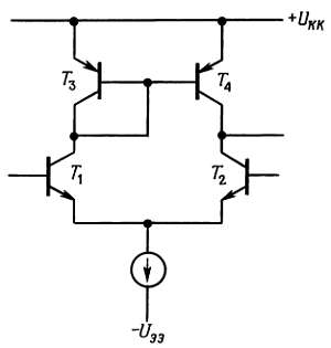 Транзисторы Т1 и Т2 образуют дифференциальную пару с источником тока в эмиттерной цепи. Транзисторы Т3 и Т4, образующие токовое зеркало, выступают в качестве коллекторной нагрузки. Тем самым обеспечивается высокое значение сопротивления коллекторной нагрузки, благодаря этому коэффициент усиления по напряжению достигает 5000 и выше при условии, что нагрузка на выходе усилителя отсутствует. Такой усилитель используют, как правило, только в схемах, охваченных петлей обратной связи, или в компараторах (их мы рассмотрим в следующем разделе). Запомните, что нагрузка для такого усилителя обязательно должна иметь большой импеданс, иначе усиление будет существенно ослаблено.