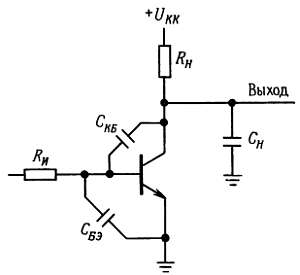 Выходная емкость образует RC-цепь с выходным сопротивлением Rн (сопротивление Rн включает в себя как сопротивление коллектора, так и сопротивление нагрузки, а емкость Сн — емкость перехода и емкость нагрузки), в связи с этим спад сигнала начинается при частоте f = 1/2πRнСн. То же самое можно сказать о входной емкости и сопротивлении источника RU.