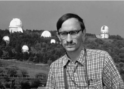 Рис. 2.2. Студент МГУ Сергей Шугаров, открывший Новую Лебедя 1975 г., на фоне башни 2,6-метрового рефлектора им. Г. А. Шайна Крымской астрофизической обсерватории.