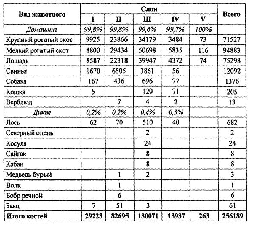 Данные видового анализа костных остатков животных по совокупной коллекции в количестве 256189 единиц из пяти хронологически последовательных слоев с XI по XX вв. представлены в таблице 1.