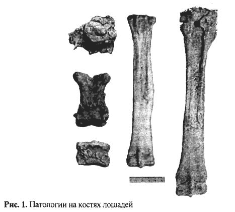 В слое V («домонгольский» период) диагностированные остатки лошадей принадлежали только взрослым животным. Две трети из них были особи в возрасте 4—10 лет. Одна треть животных забивалась уже после достижения ими 10 лет. Такое отсутствие костей молодых животных свидетельствует о прижизненной ценности лошадей и использовании их на мясо только в чрезвычайных ситуациях в результате выбраковки. Как правило, в тот период лошадь использовалась в основном под седлом для военных целей. Для перевозки грузов и в пашенном земледелии активно использовали волов и быков [Петренко 1984]. Соответственно, лошади были высокоценными животными и забивали их в случае невозможности прижизненной эксплуатации, например из-за полученных травм. О реальности таких ситуаций свидетельствуют находки нескольких целых костей конечностей и их фрагментов, в основном метаподий и фаланг с разрастаниями костных тканей в результате воспаления (рис. 1).