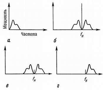 Следует отметить, что смеситель (модулятор) всегда рассматривается как схема сдвига частоты, особенно когда он сочетается с соответствующим фильтром для подавления нежелательных выходных сигналов. Когда он используется в качестве модулятора, полоса низкочастотного сигнала сдвигается вверх на частоту несущего сигнала и образуется полоса, симметричная к fн. Если он используется как смеситель, то частотная зона вокруг fн сдвигается под действием высокой частоты ЛГ вниз до звуковых частот («основной полосы») или до зоны, симметричной к промежуточной частоте (ПЧ).