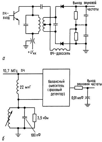 Рис. 13.45. ЧМ-дискриминаторы. а — дробный детектор; б — балансный квадратурный детектор.