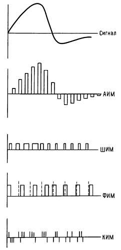 В амплитудно-импульсной модуляции (АИМ) последовательность импульсов с амплитудами, пропорциональными сигналу, передается через регулярные промежутки времени. Эта схема полезна для временного разделения нескольких сигналов при передаче их по одному каналу связи, так как время между выборками может быть использовано для передачи выборки другого сигнала (конечно, при увеличении полосы пропускания). При широтно-импульсной модуляции (ШИМ) ширина (длительность) импульса постоянной амплитуды пропорциональна мгновенной амплитуде сигнала. ШИМ легко декодируется простым усреднением.