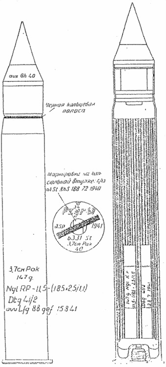 К боеприпасам этого типа относится также надкалиберная мина кумулятивного действия к 37-мм противотанковой пушке.