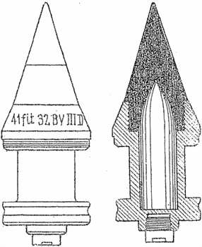 Снаряд кумулятивного действия B ("Hl/B") к 75-мм танковой пушке обр. 40 и снаряд кумулятивного действия A ("Hl/A") к 105-мм легкой полевой гаубице обр. 18 (фиг. 79 и 80). Эти снаряды по сравнению с вышеописанными являются новыми, более совершенными. Их отличие от старых сводится и следующему: