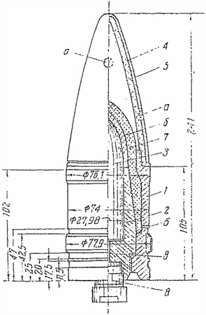 Балистический наконечник состоит из штампованного из листового железа колпака 4 и запрессованного в него слоя пластмассы 5. Колпак 4 изготовлен из железа, содержащего углерода около 0,2 %, марганца 0,3 %, фосфора 0,024 % и серы 0,027 %. Для увеличения прочности скрепления железного колпака 4 с пластмассой на нем имеется шесть отверстий а, расположенных в два ряда по окружности в шахматном порядке.