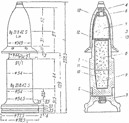 Бронебойный снаряд обр. 41 к 28/20-мм противотанковой пушке (фиг. 72) состоит из сердечника 1, поддона 2, и балистического наконечника 3.