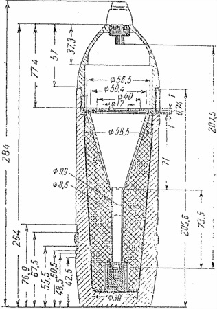 Длина окончательно снаряженного снаряда 283 мм