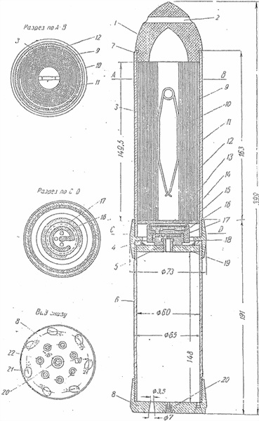 Снаряд состоит из корпуса, головки, взрывателя, разрывного заряда, детонатора, помещенного в оболочке капсюля-детонатора, центральной трубки, скрепленной с колпачком, и некоторых других деталей.
