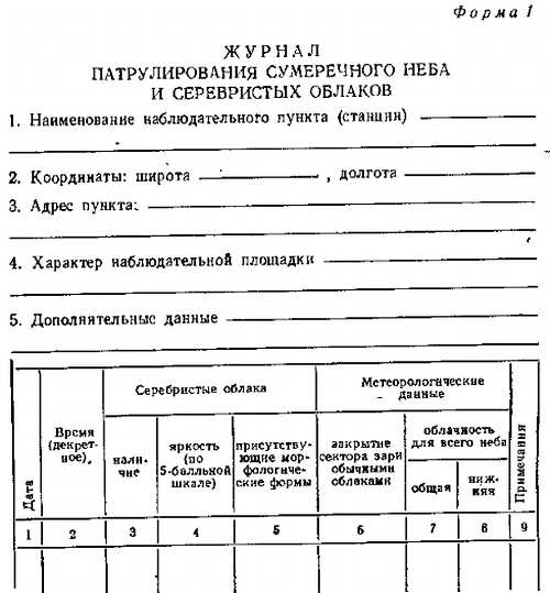 В графу 5 заносятся обозначения наблюдаемых морфологических форм серебристых облаков, в соответствии с классификацией, приведенной в § 4, например, II-а, III-а, IV-b.