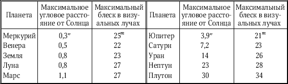 Предположим, что наблюдатель находится у ближайшей к нам звезды а Кентавра и смотрит в телескоп в сторону Солнечной системы. Тогда Солнце будет сиять для него так же ярко, как звезда Вега на земном небосводе. А блеск наших планет окажется для альфа-кентаврца очень слабым и к тому же сильно зависящим от ориентации в его сторону дневного полушария планеты. В табл. 6.2 приведены самые «выгодные» значения углового расстояния планет от Солнца и их оптического блеска. Понятно, что одновременно они реализоваться не могут: при максимальном угловом расстоянии планеты от Солнца ее яркость будет примерно вдвое меньше максимальной.