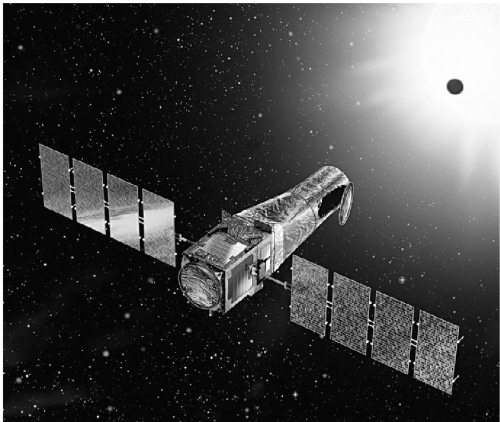 Рис. 6.4. Космический телескоп COROT: слева – подготовленный к запуску; справа – в процессе наблюдения за прохождением планеты по диску звезды (рисунок D. Ducros, CNES). Размер спутника: длина 4Д м, диаметр 2 м (без панелей солнечных батарей). Полная масса 630 кг, масса научной аппаратуры 300 кг. Точность наведения телескопа 0,5?. Мощность канала связи 1,5 Гбит/сутки. Основной вклад в создание этой космической обсерватории внес Национальный центр космических исследований Франции (Centre national d’etudes spatiales – CNES).