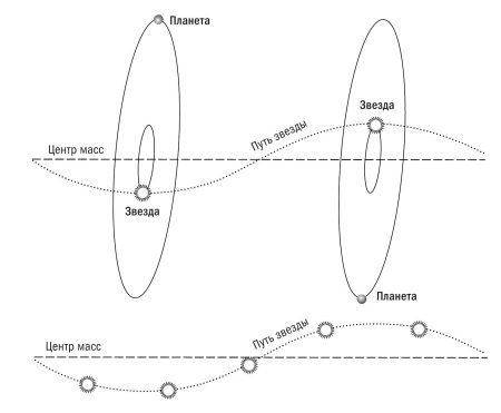 Для точного измерения скоростей звезд астрономы используют эффект Доплера. Он проявляется в том, что в спектре звезды, движущейся относительно земного наблюдателя, изменяется длина волны всех линий: если звезда приближается к Земле, линии смещаются к синему концу спектра, если удаляется – к красному. При нерелятивистских скоростях движения эффект Доплера чувствителен лишь к лучевой скорости звезды, т. е. к проекции полного вектора ее скорости на луч зрения наблюдателя (прямую, соединяющую наблюдателя со звездой). Поэтому скорость движения звезды, а значит, и масса планеты определяются с точностью до множителя cos а, где а – угол между плоскостью орбиты планеты и лучом зрения наблюдателя. Вместо точного значения массы планеты (М) доплеровский метод дает лишь нижнюю границу ее массы (М · cos ?).