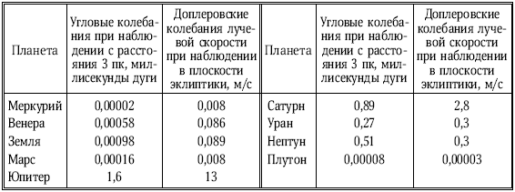 Обычно угол а неизвестен. Лишь в тех случаях, когда наблюдаются прохождения планеты по диску звезды, можно быть уверенным, что угол а близок к нулю. Но у доплеровского метода есть два важных преимущества: он работает на любых расстояниях (разумеется, если удается получить спектр), и его точность почти не зависит от расстояния. В табл. 6.3 показаны характерные значения доплероской скорости и углового смещения Солнца под влиянием каждой из планет. Плутон здесь присутствует как прототип планет-карликов.